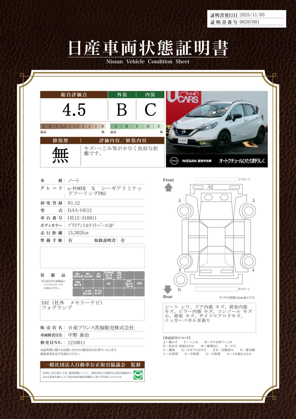 車両状態(ノート e-パワー X シーギア ツーリングパッケージ装着車)