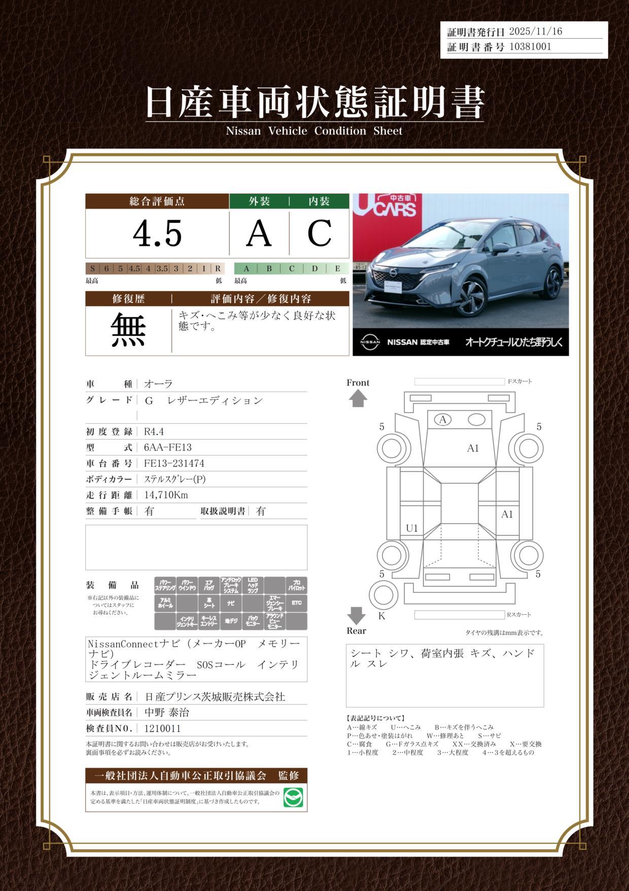 車両保証(オーラ G レザーエディション:茨城日産自動車株式会社オートクチュールひたち野うしく)