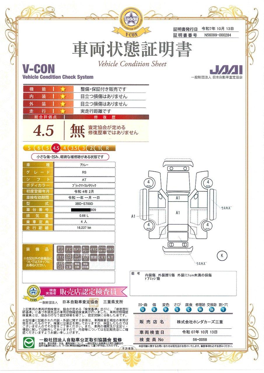 車両保証(アトレー RS:Honda Cars 三重 U-Select 多気クリスタルタウン)