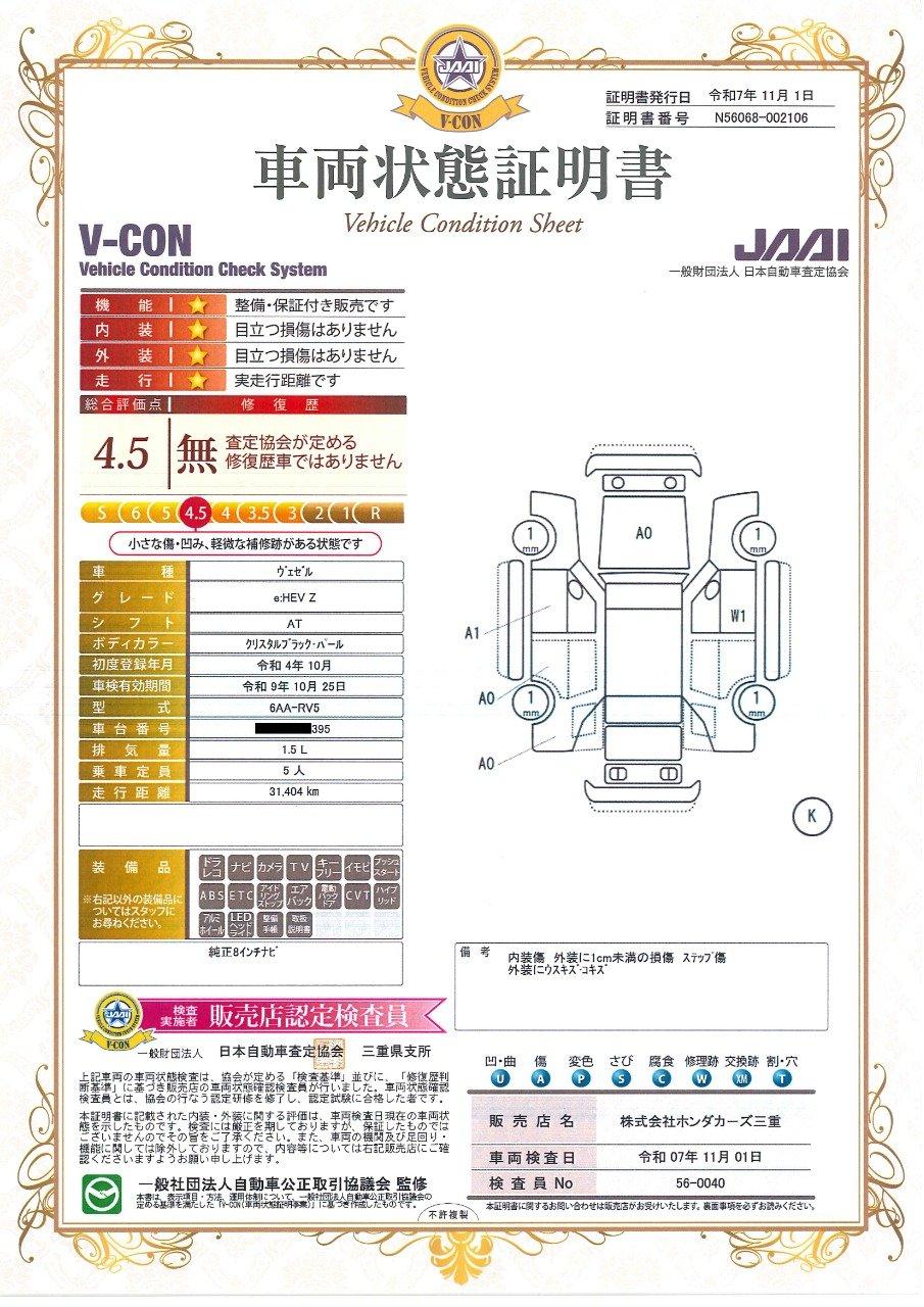 車両保証(ヴェゼル e:HEV Z:Honda Cars 三重 U-Select 多気クリスタルタウン)