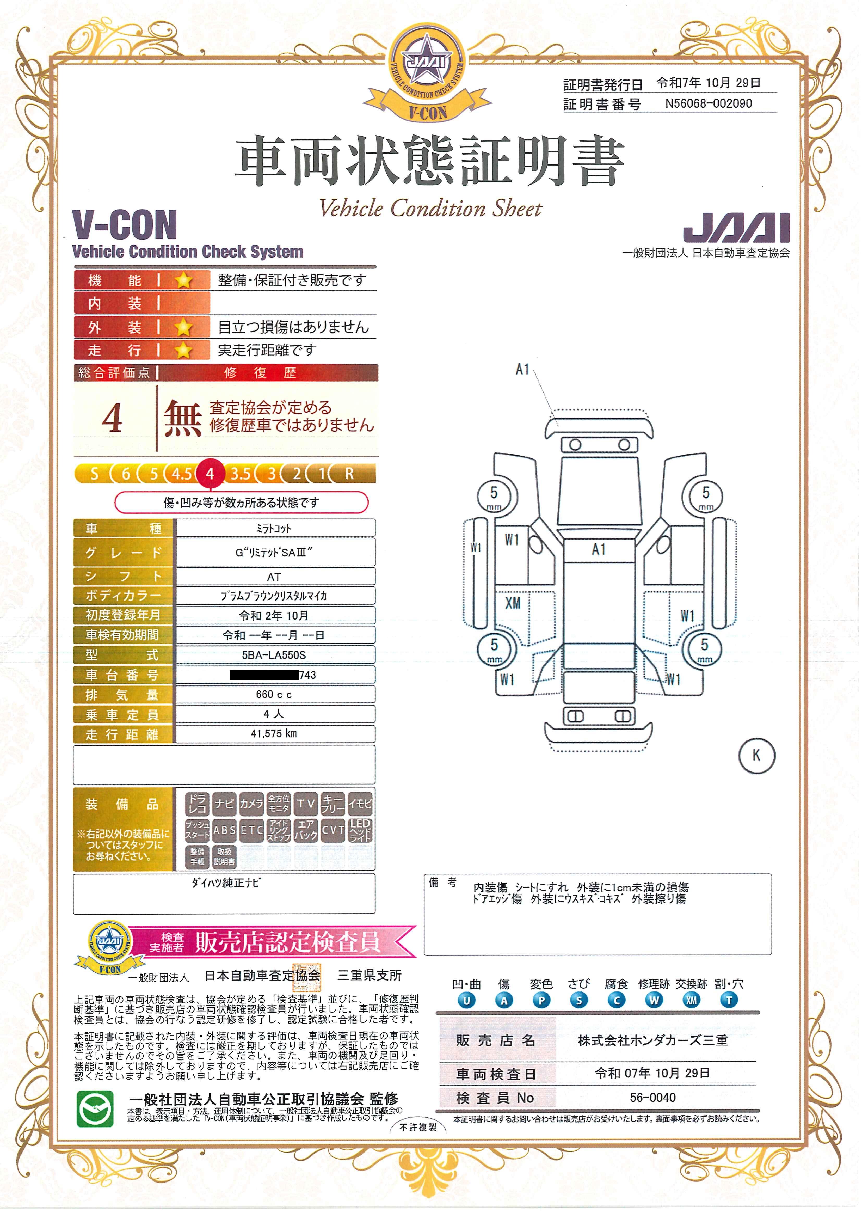 | 車両状態評価書 | ※クリックすると開きます![]() |