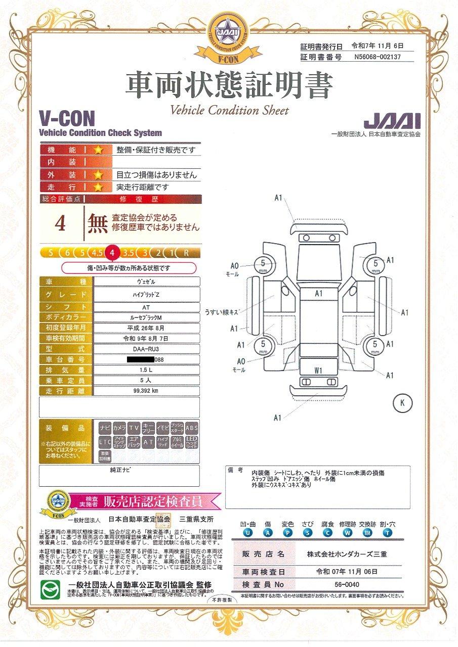 車両保証(ヴェゼル ハイブリッドZ:Honda Cars 三重 U-Select 多気クリスタルタウン)