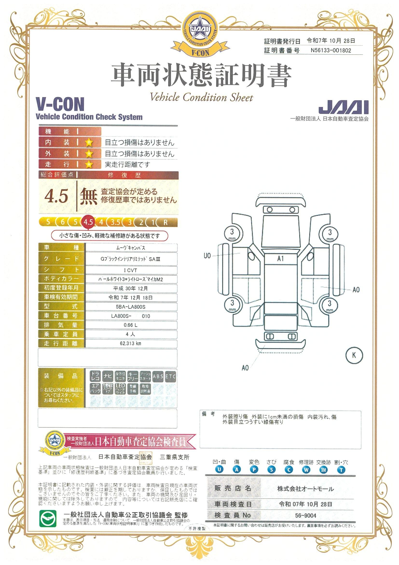 | 車両状態評価書 | ※クリックすると開きます![]() |