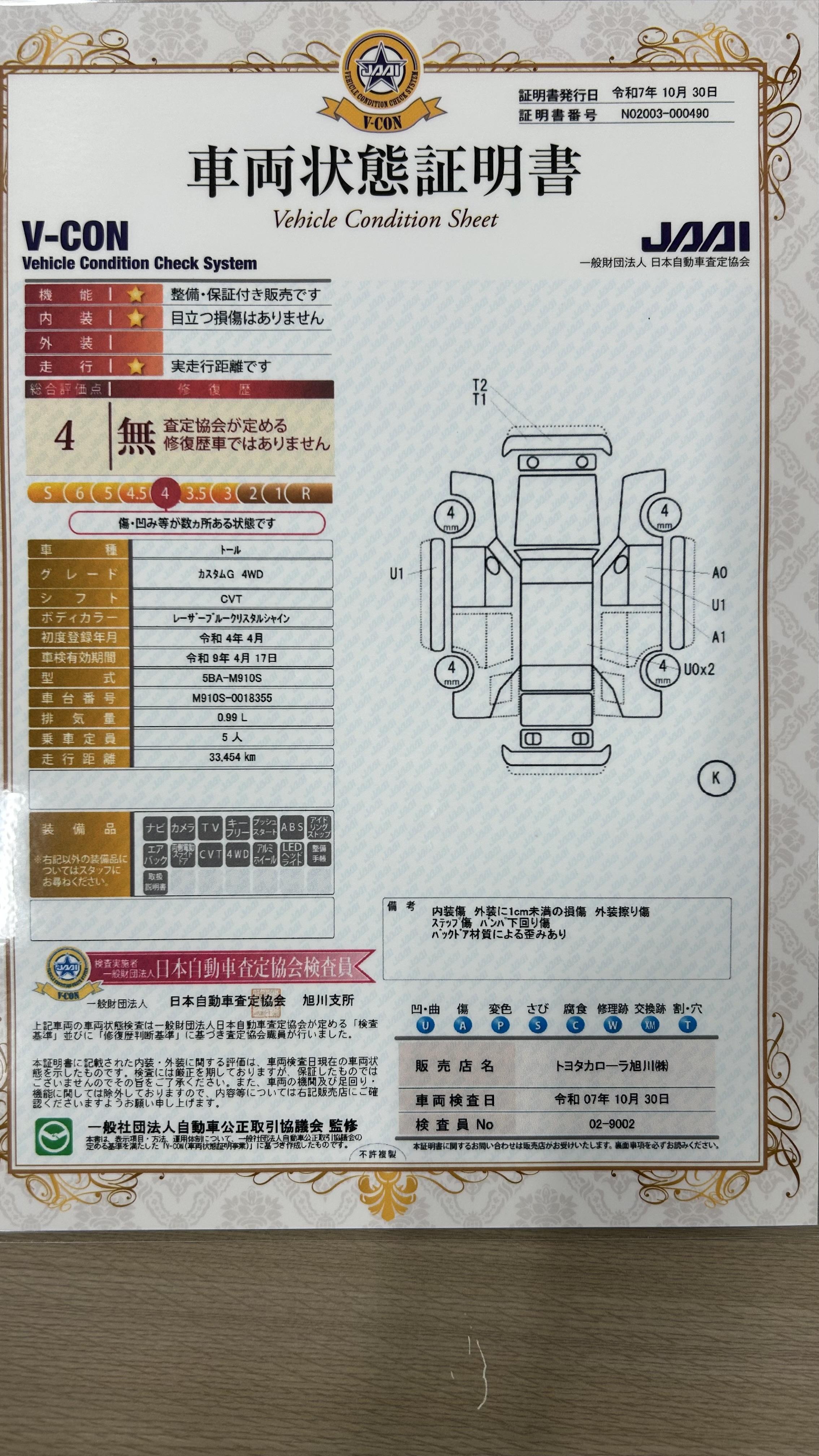車両保証(トール カスタムG:トヨタカローラ旭川(株) 旭川店)