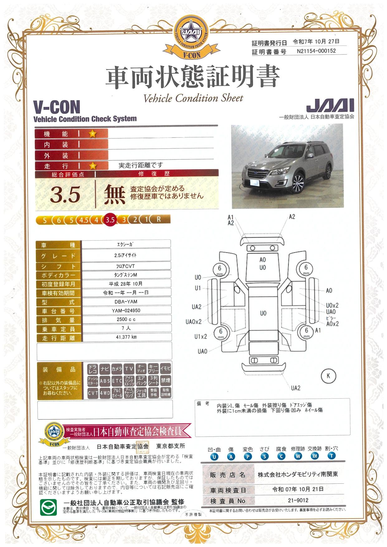 車両保証(エクシーガクロスオーバー7 2.5iアイサイト:CAR PLAT 八王子南)