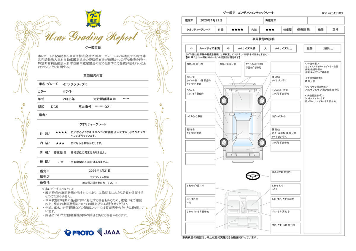 | 車両状態評価書 | ※クリックすると開きます![]() |