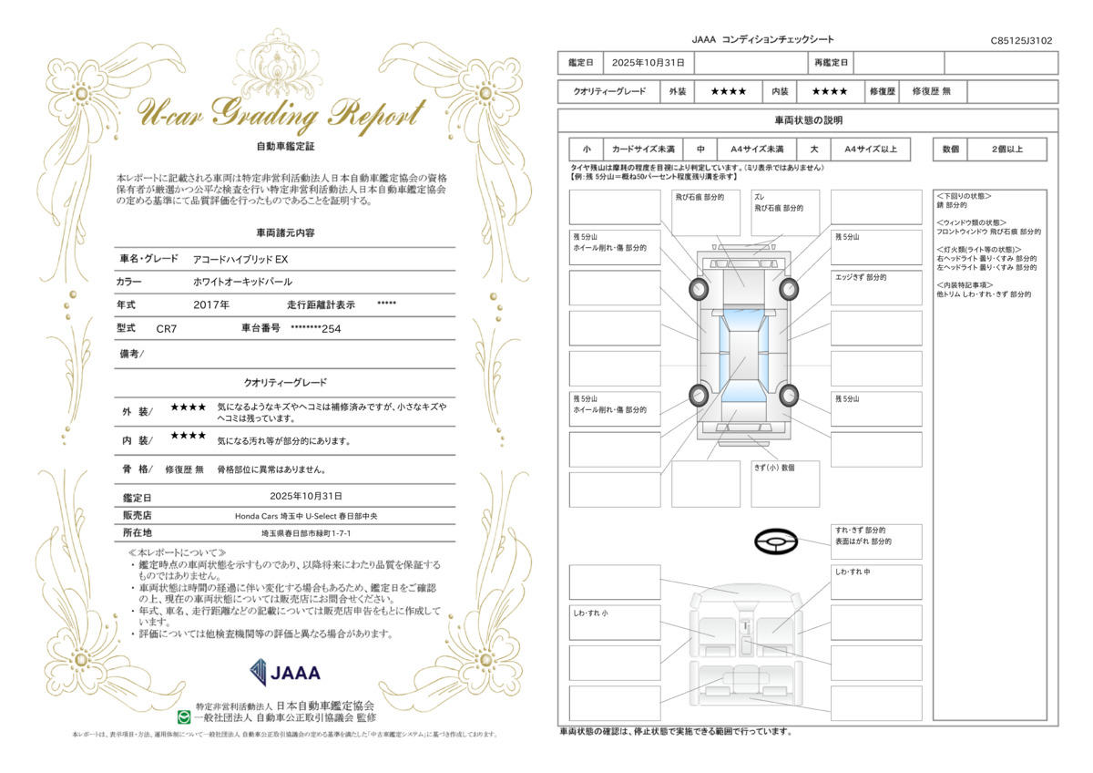 | 機関評価 | 正常 | 修復歴 | 無 |