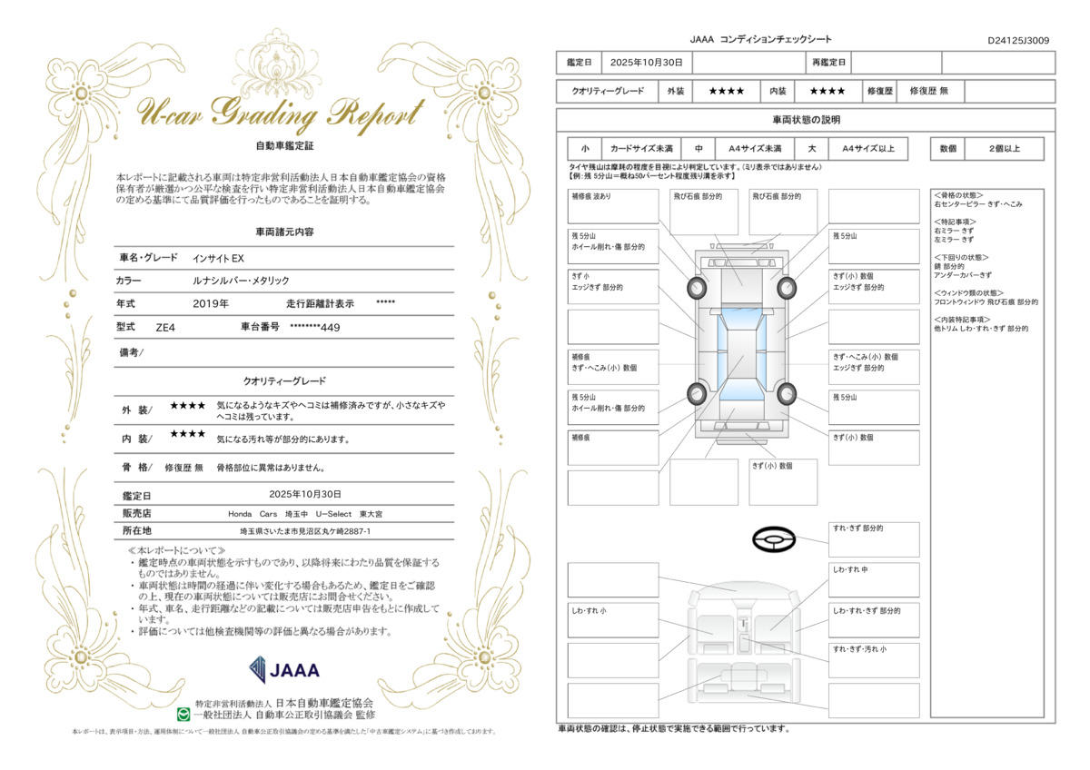 車両保証(インサイト EX:Honda Cars 埼玉中 岩槻 U-Selectコーナー店)