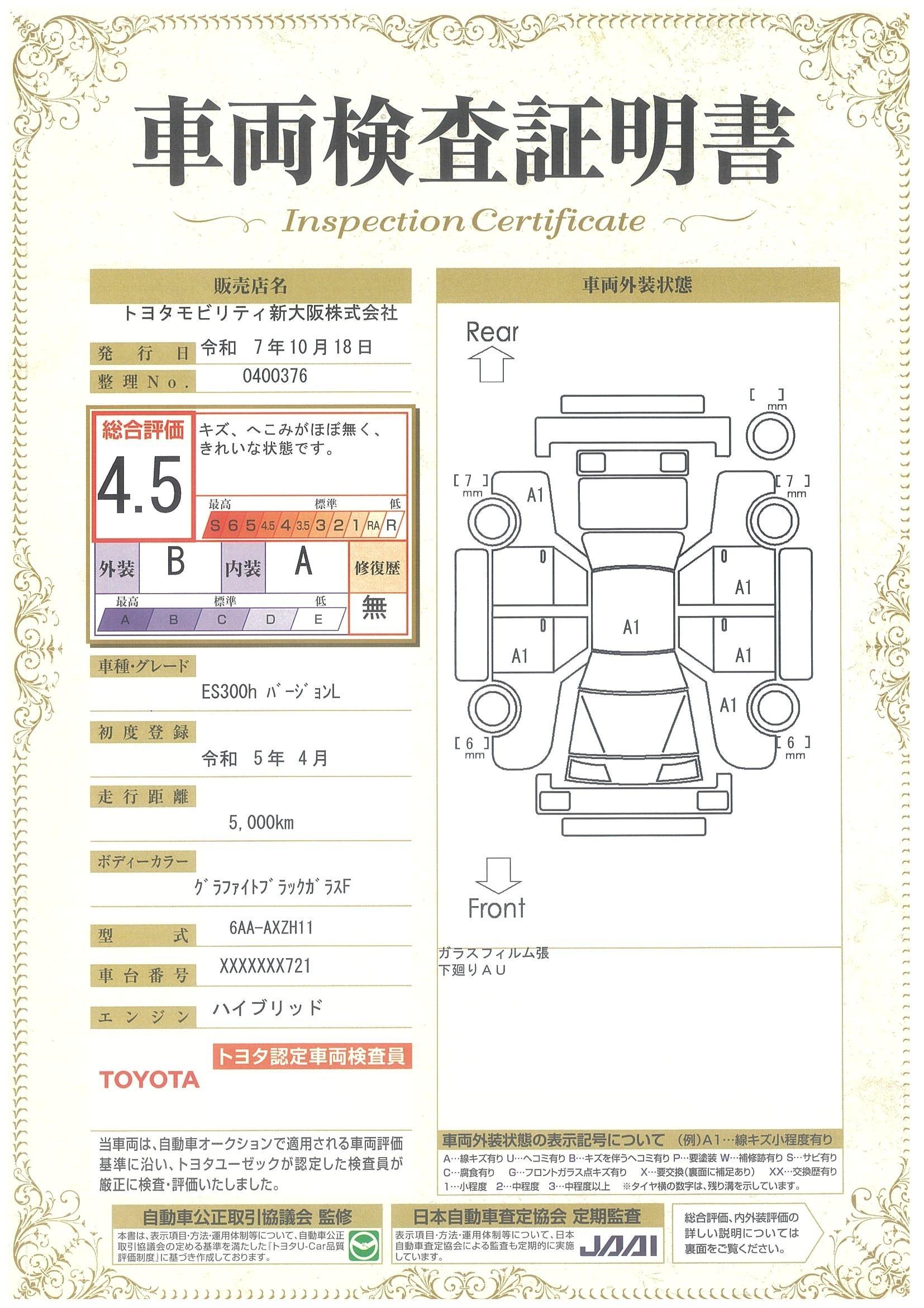 ES300h バージョンL 認定中古車 マークレビンソンプレミアムサラウンドサウンドシステム デジタルインナーミラー IRカットフィルム サイドバイザーフロアマット(タイプA) ナンバーフレーム ドアエッジプロテクター