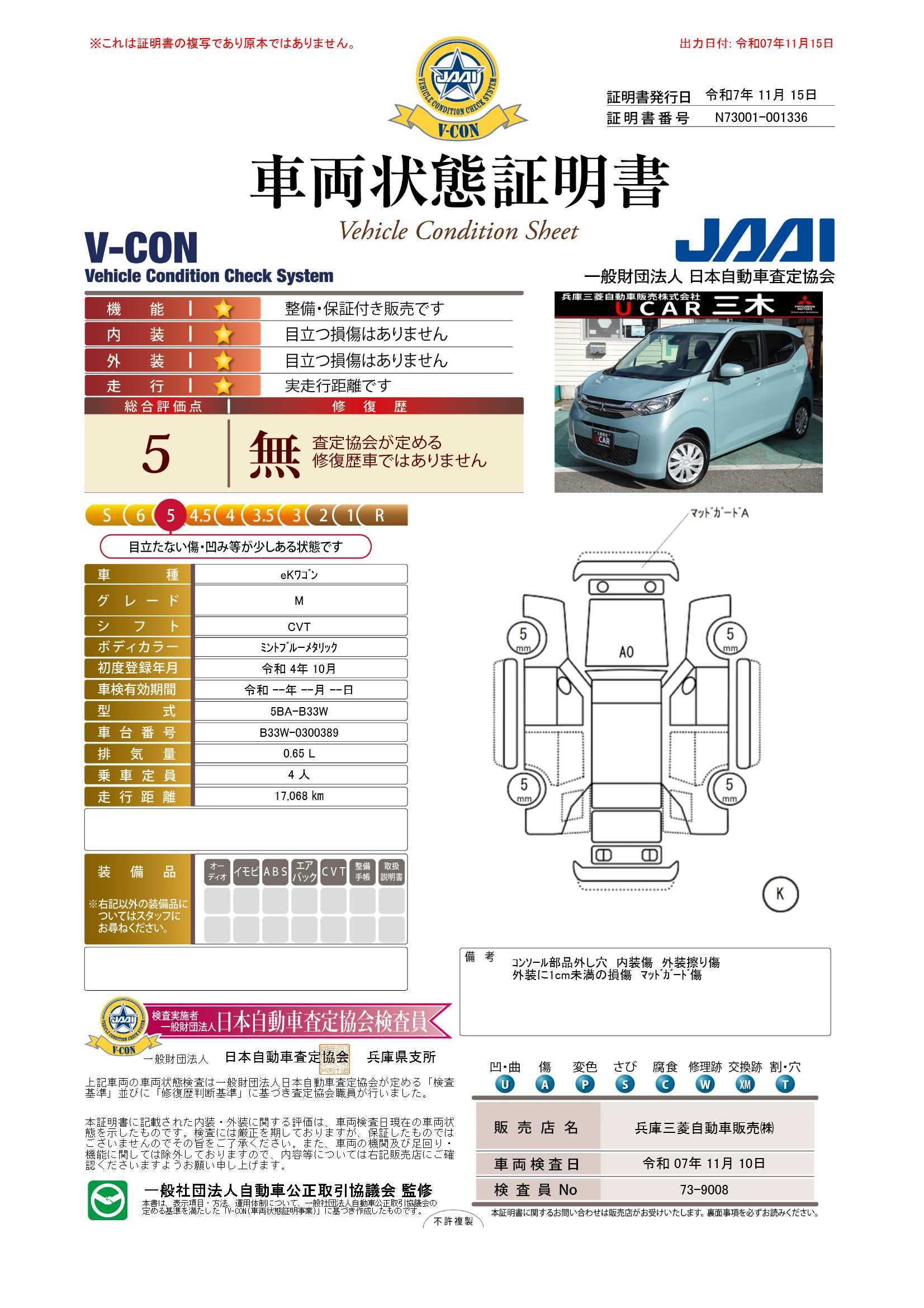 車両保証(eKワゴン M:兵庫三菱自動車販売(株)UCAR三木)