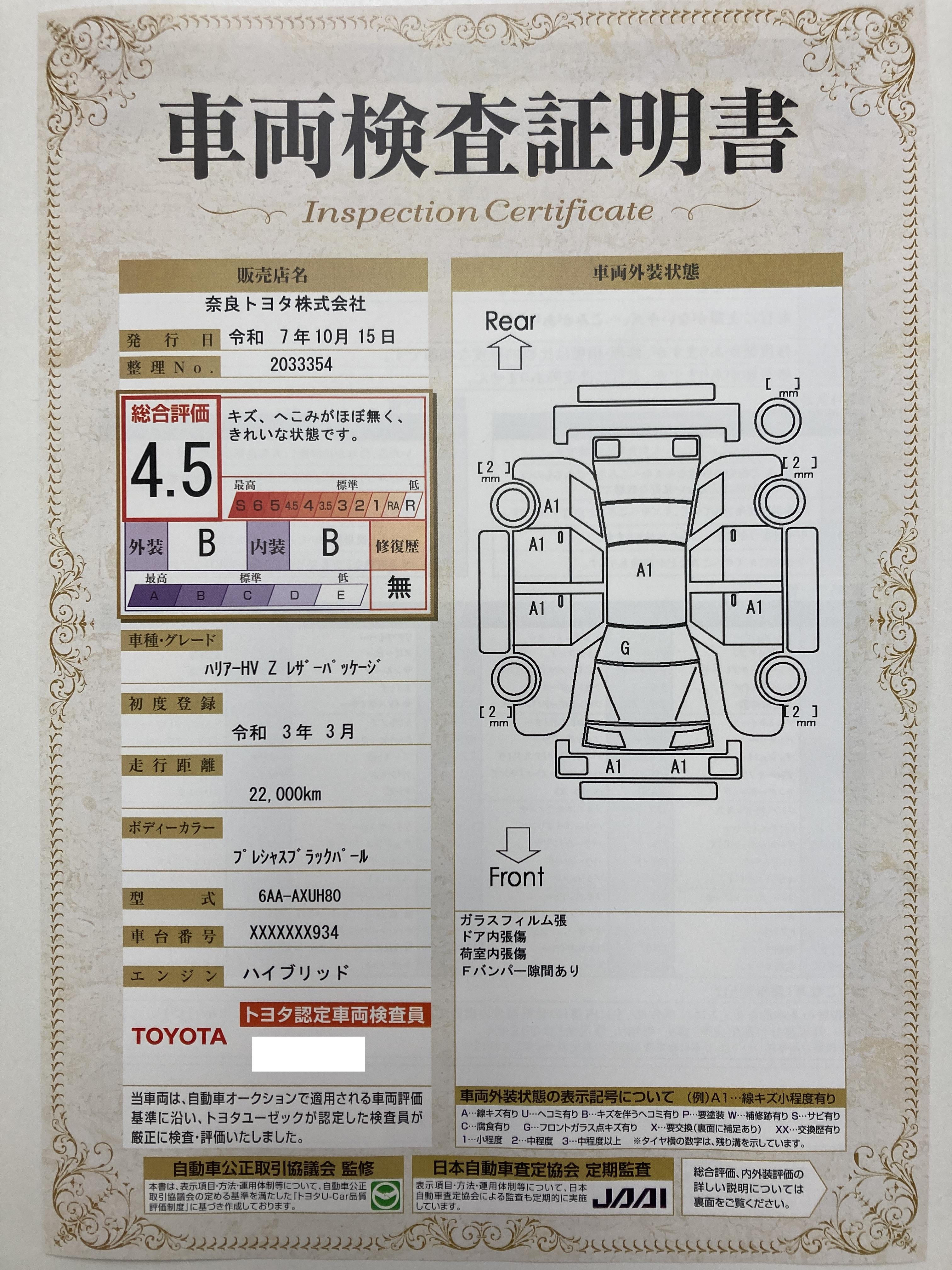 車両保証(ハリアーハイブリッド Z レザーパッケージ:奈良トヨタ株式会社 U-Car葛城店)
