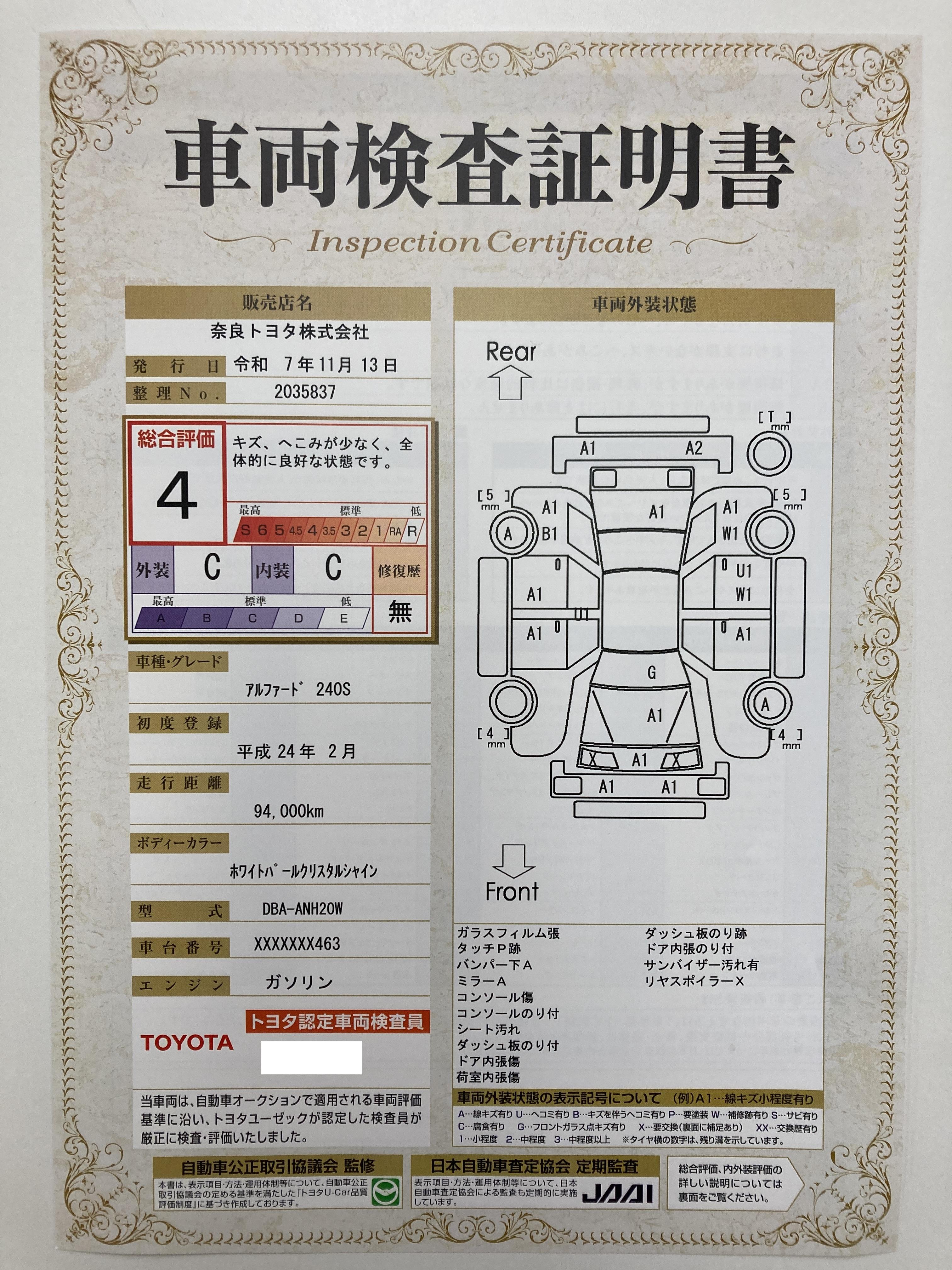 車両保証(アルファード 240S:奈良トヨタ株式会社 U-Car葛城店)