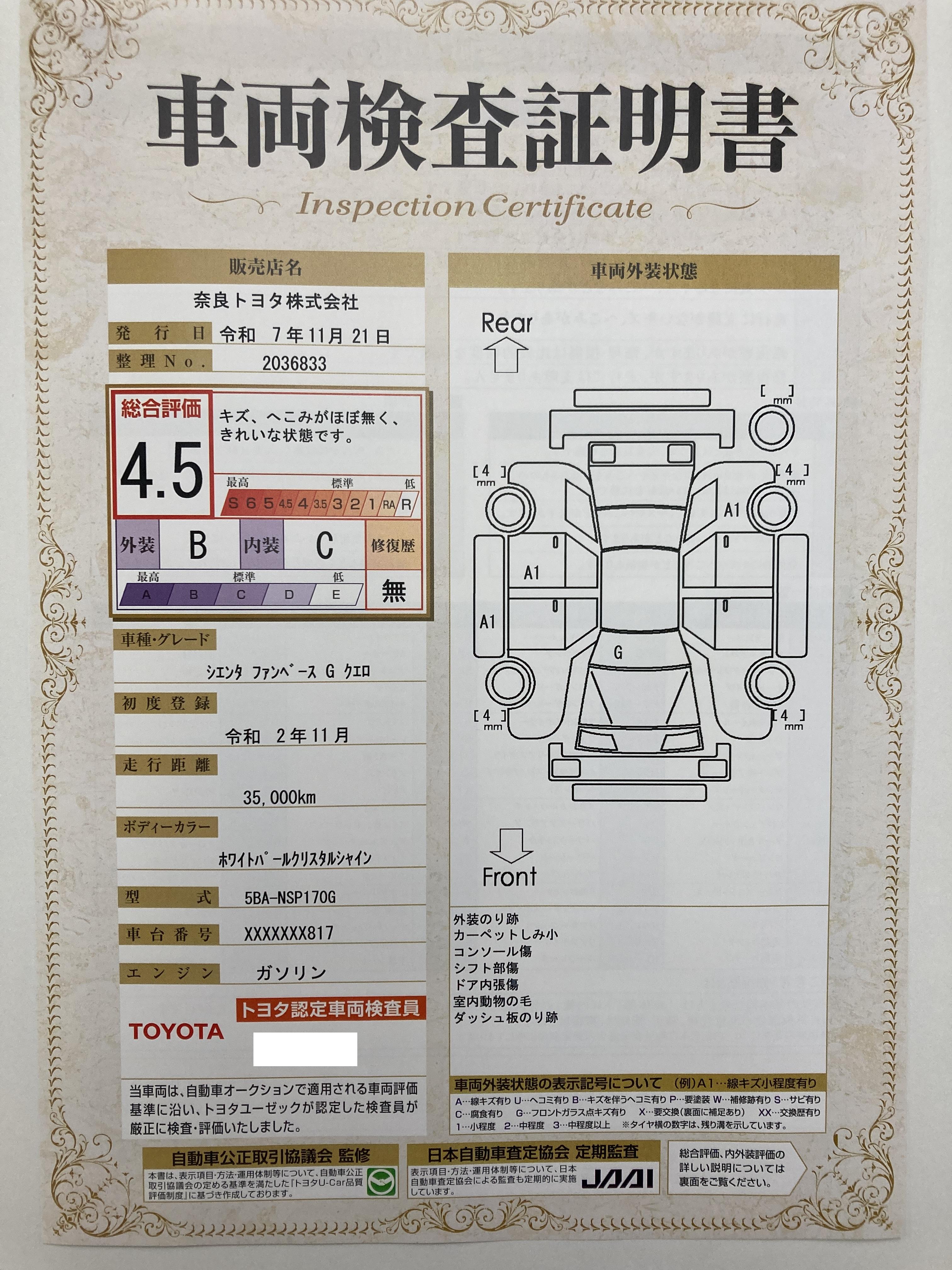 車両保証(シエンタ ファンベースG クエロ:奈良トヨタ株式会社 U-Car葛城店)