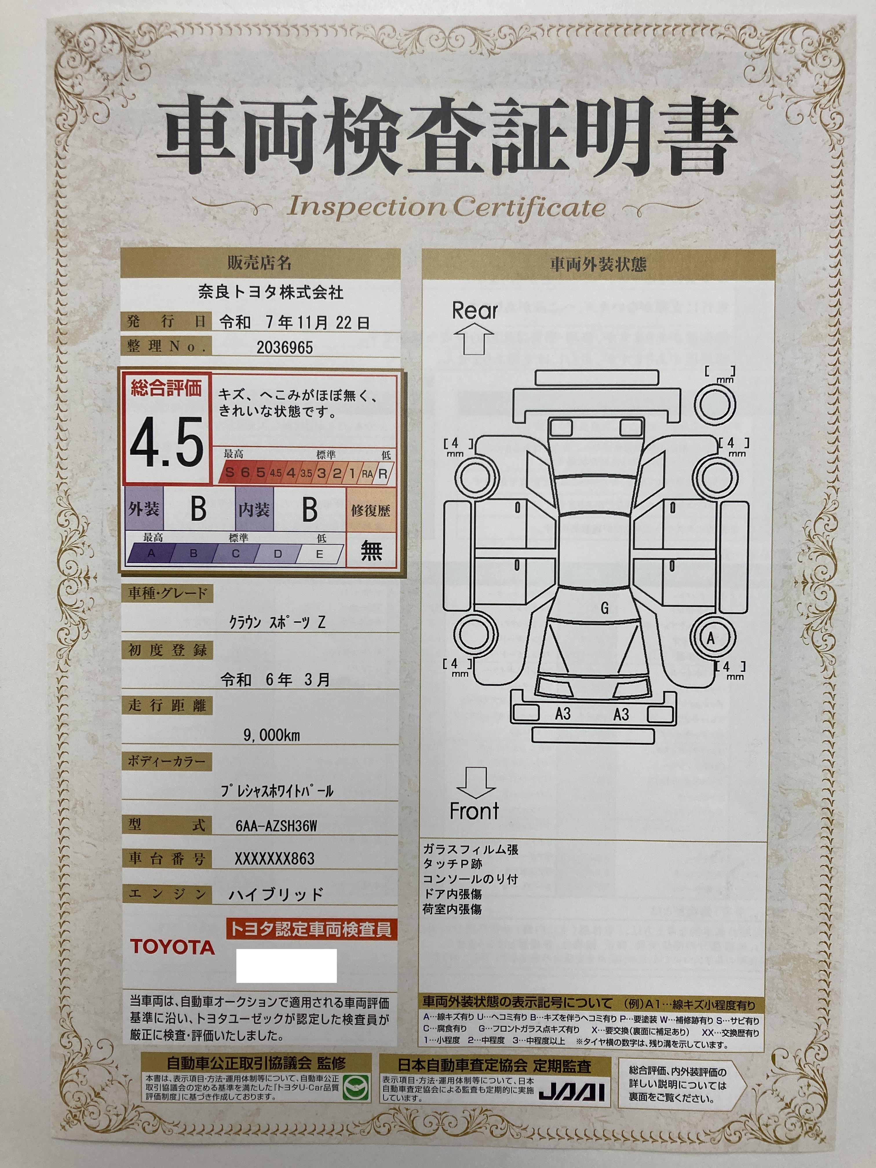 車両保証(クラウンスポーツ Z:奈良トヨタ株式会社 U-Car葛城店)