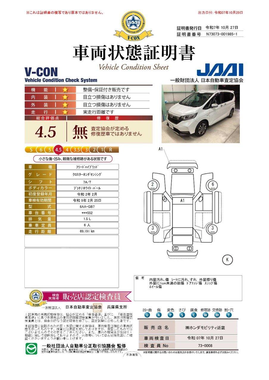 車両保証(フリードハイブリッド ハイブリッド・クロスターホンダセンシング:ホンダカーズ兵庫 三木店 (株)ホンダモビリティ近畿)