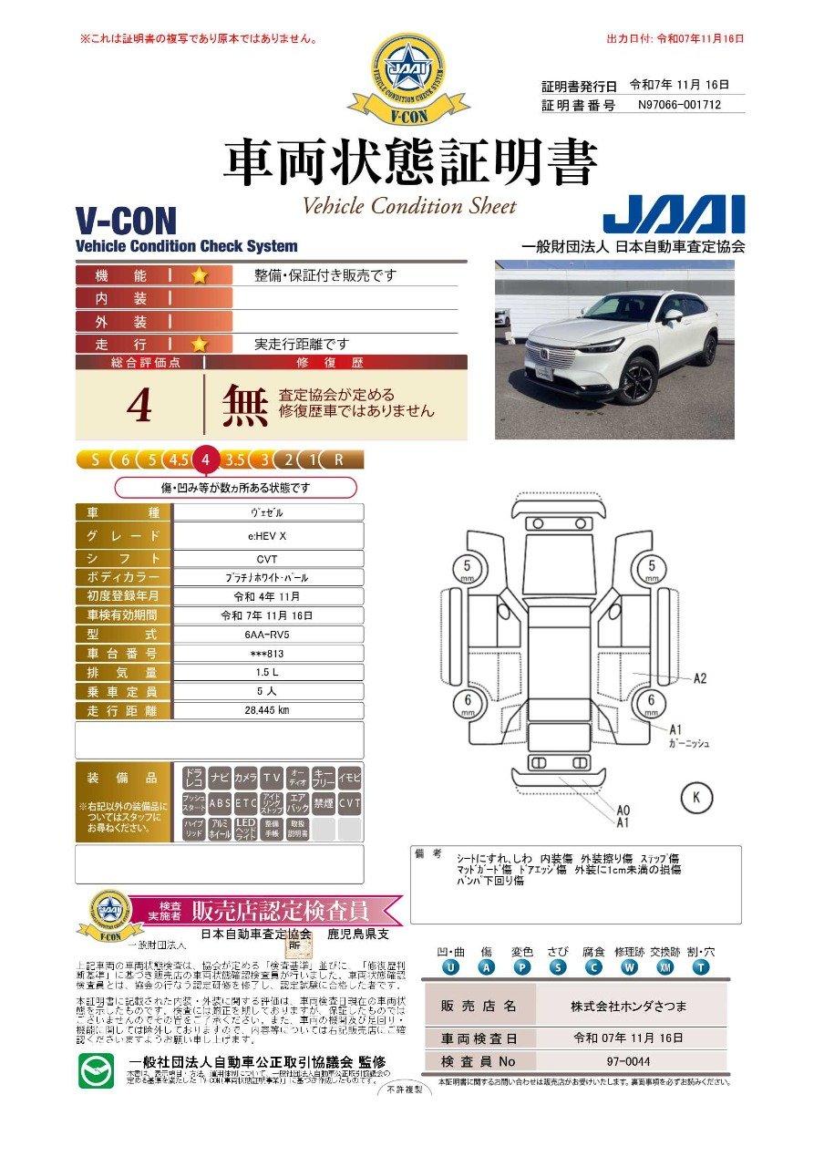 車両保証(ヴェゼル e:HEV X:Honda Cars さつま 指宿店 (株)ホンダさつま)