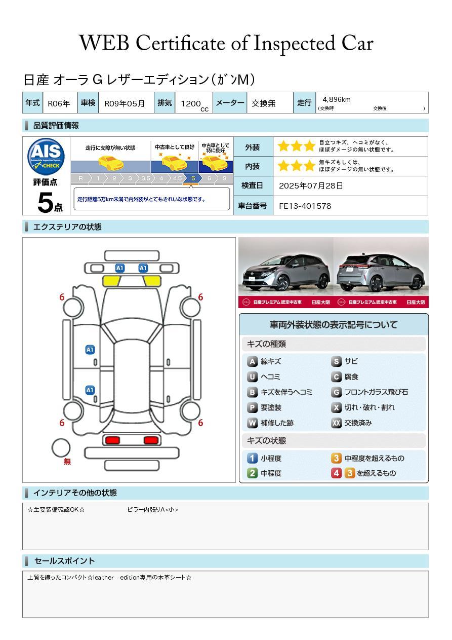 車両保証(オーラ G レザーエディション:日産大阪販売株式会社 UCARS守口)