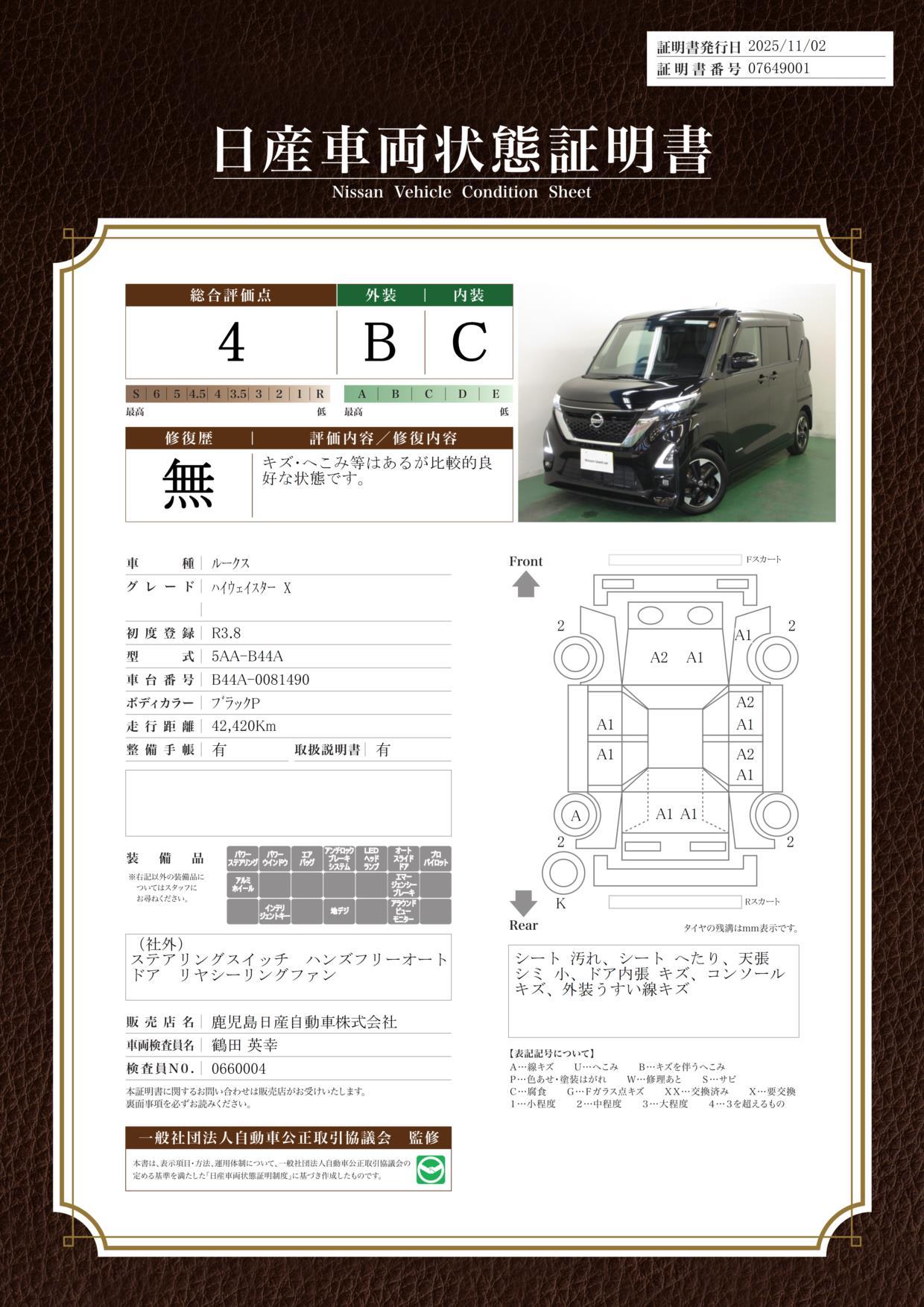 | 車両状態評価書 | ※クリックすると開きます![]() |