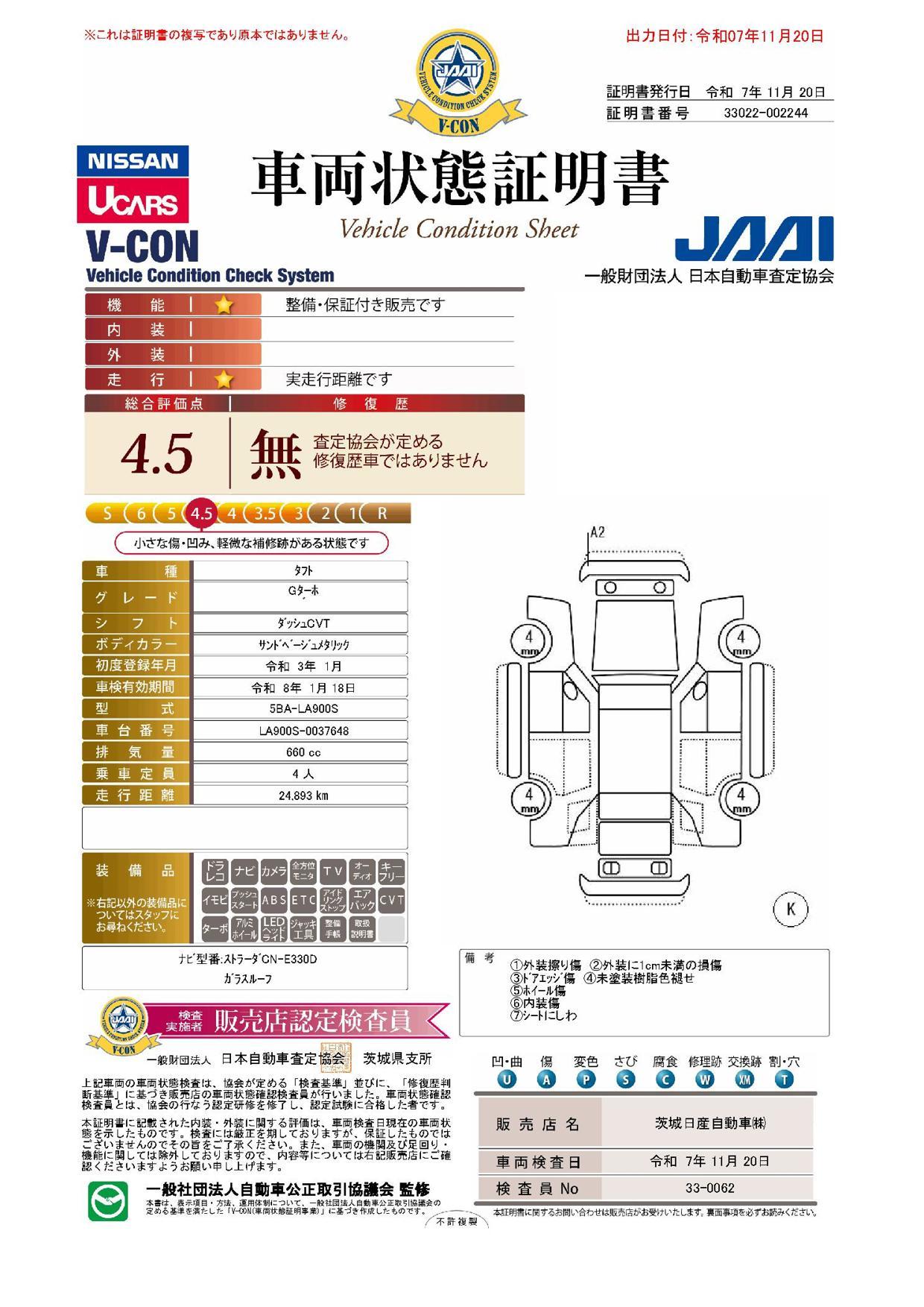 車両保証(タフト Gターボ:茨城日産自動車(株)U-Cars日立滑川店)