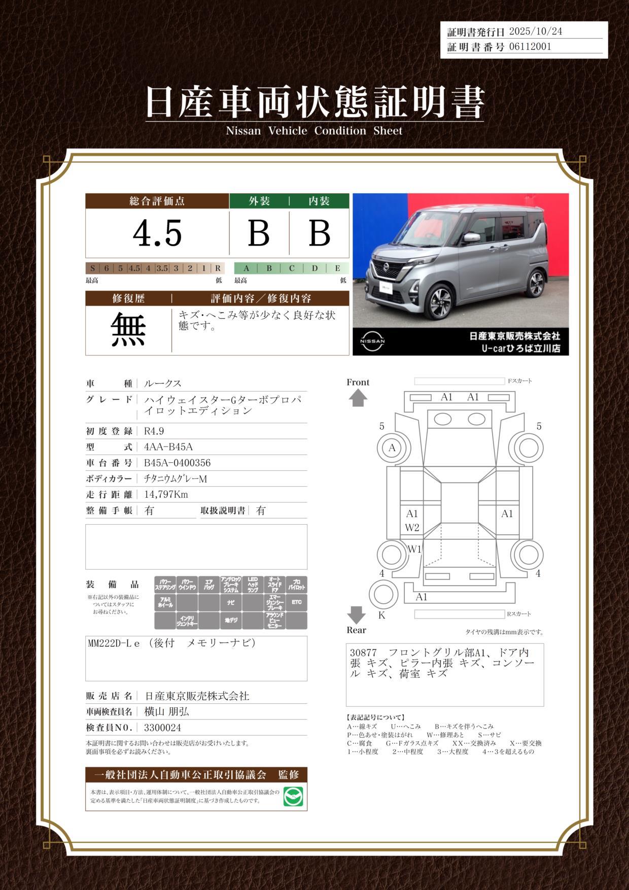 車両保証(ルークス ハイウェイスター Gターボプロパイロットエディション:日産東京販売(株) U-Carひろば立川店)