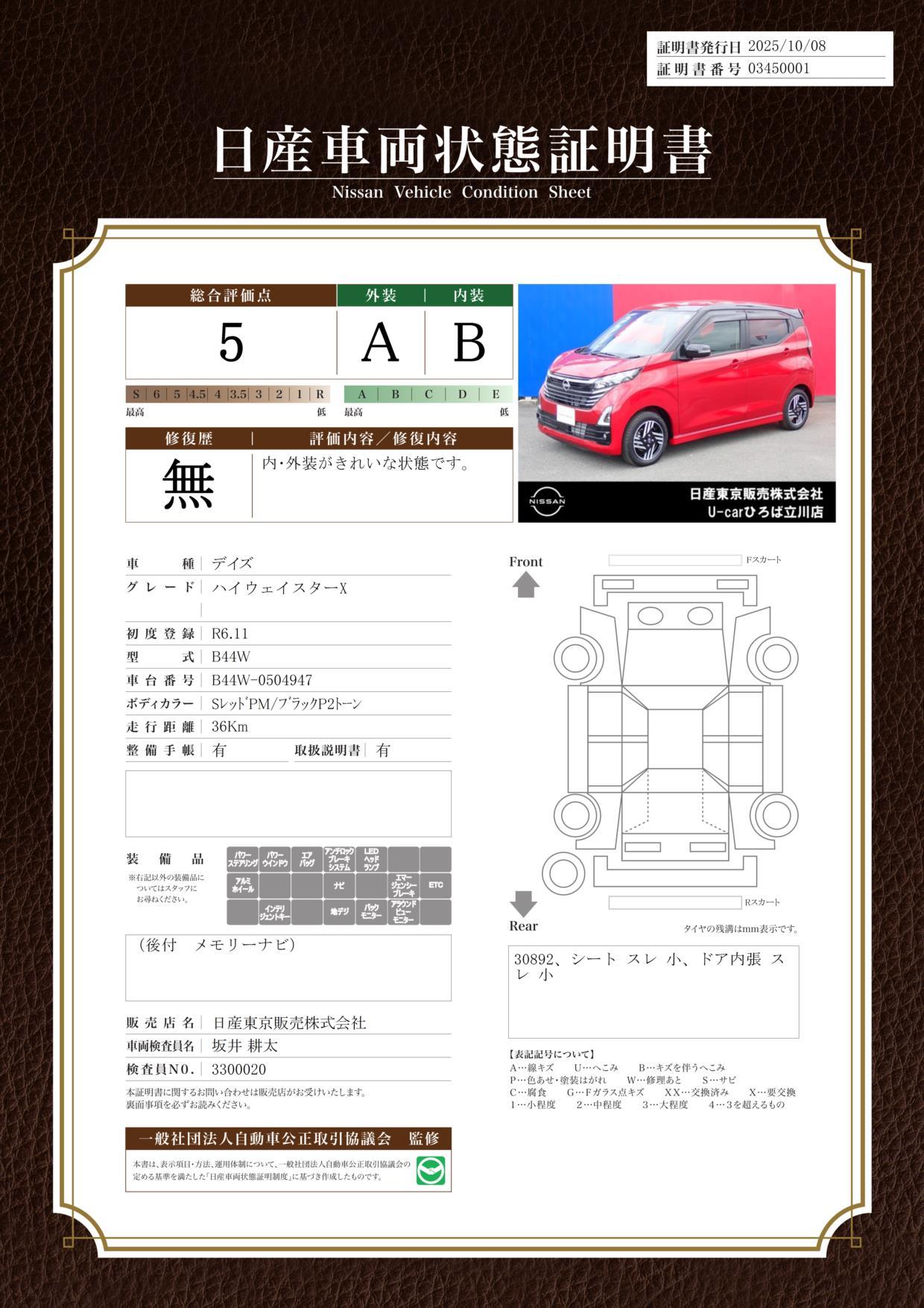 車両保証(デイズ ハイウェイスター X:日産東京販売(株) U-Carひろば立川店)