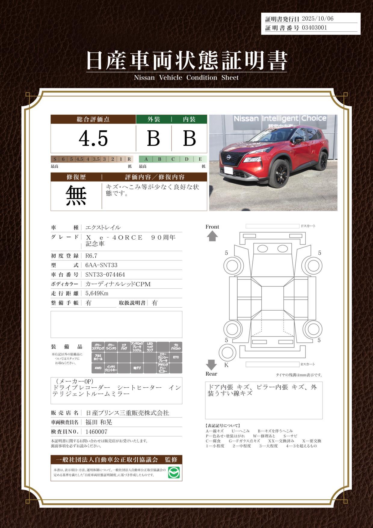 車両保証(エクストレイル X e-4ORCE 90周年記念車:日産プリンス三重販売(株) U-Car松阪)