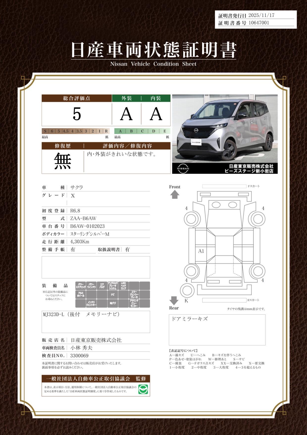 車両保証(サクラ X:日産東京販売(株) P’sステージ新小岩)