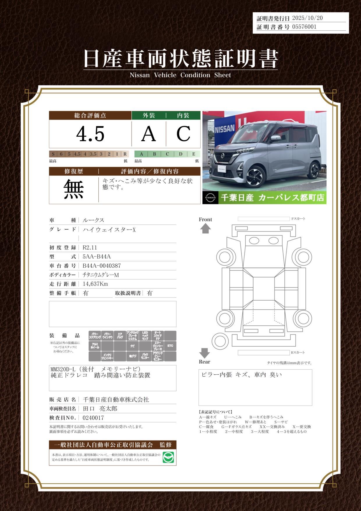 | 車両状態評価書 | ※クリックすると開きます![]() |