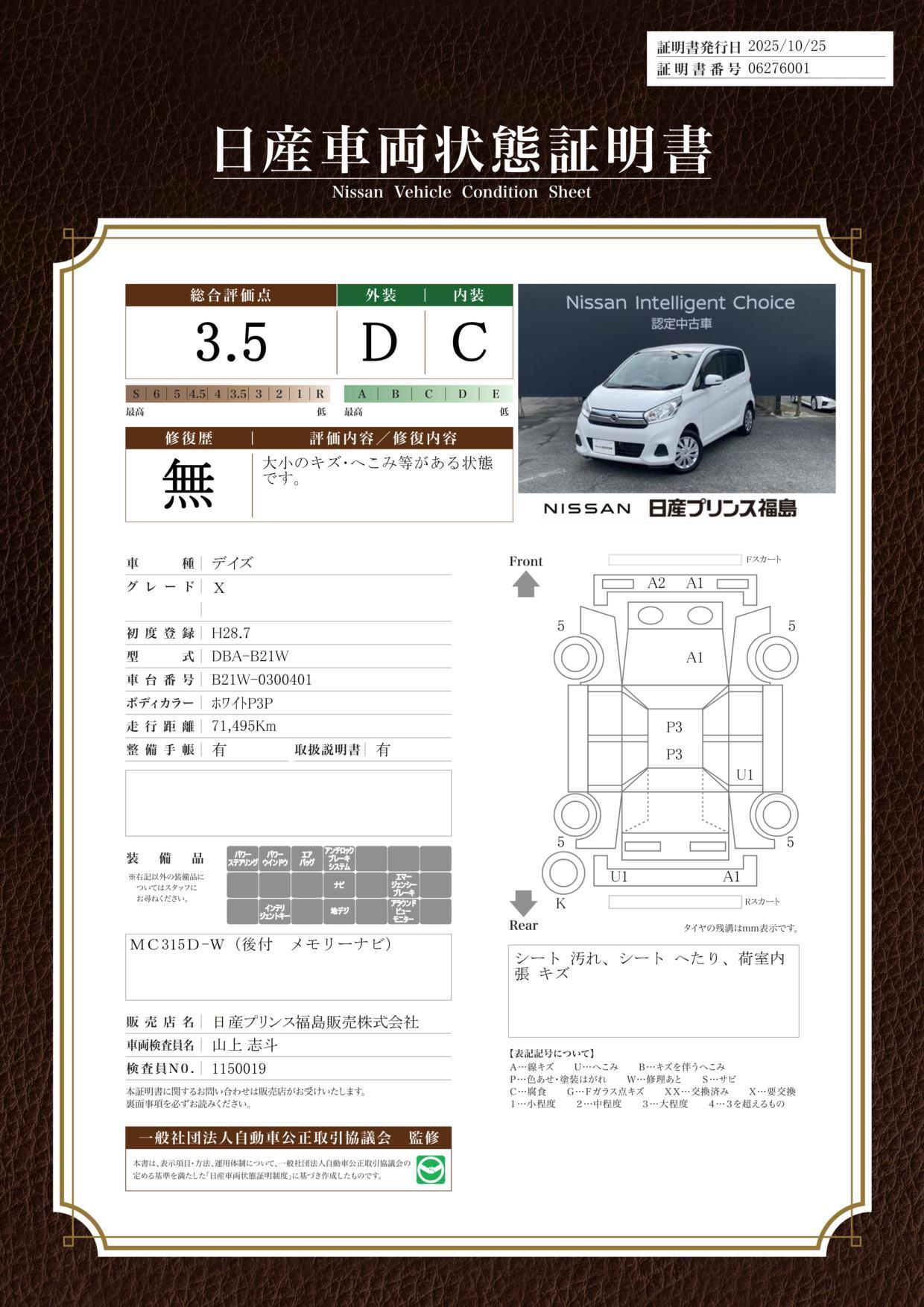 車両保証(デイズ X:日産プリンス福島販売(株) Pステージ23)