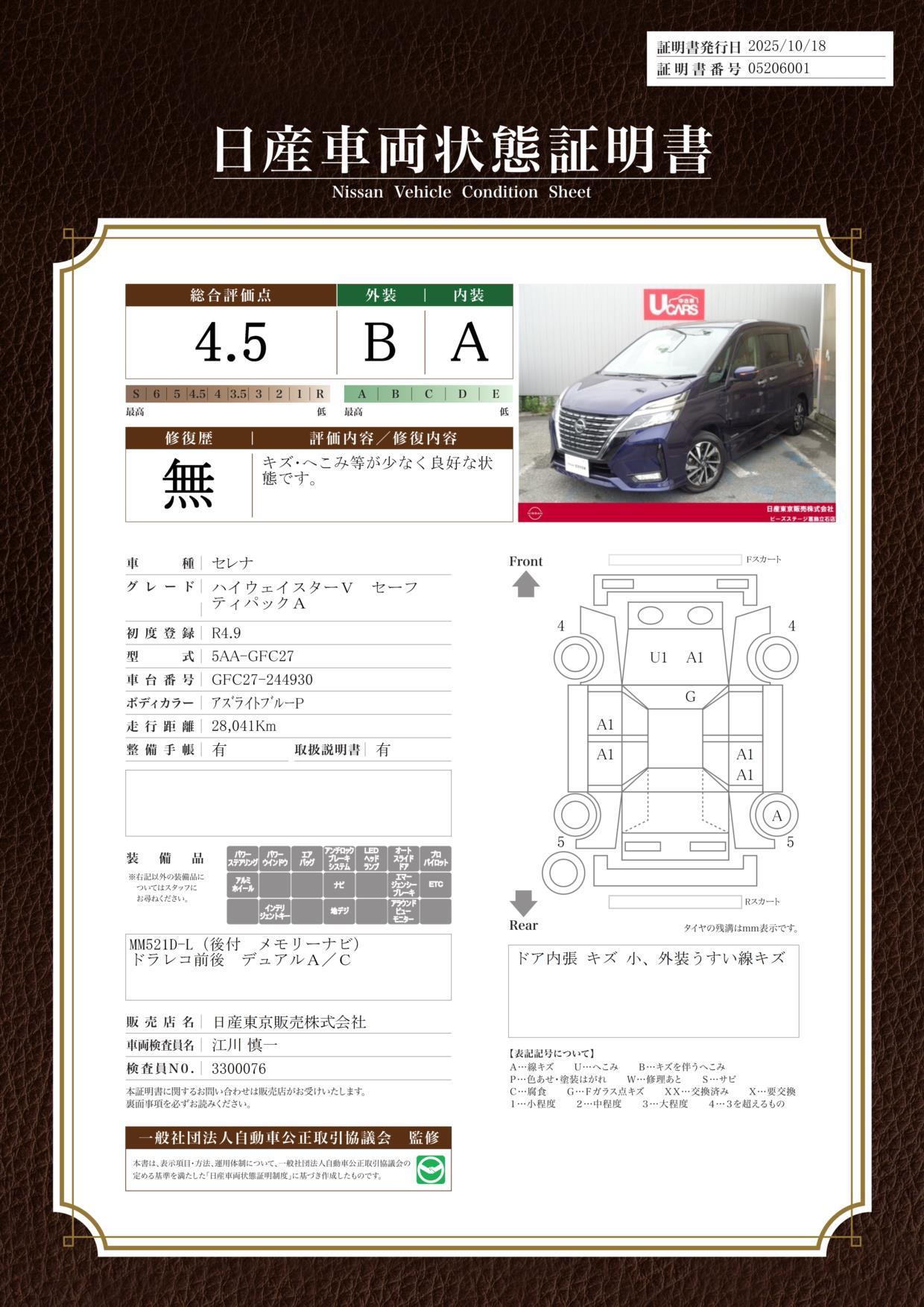 車両保証(セレナ ハイウェイスターV:日産東京販売(株) P’sステージ葛飾立石)
