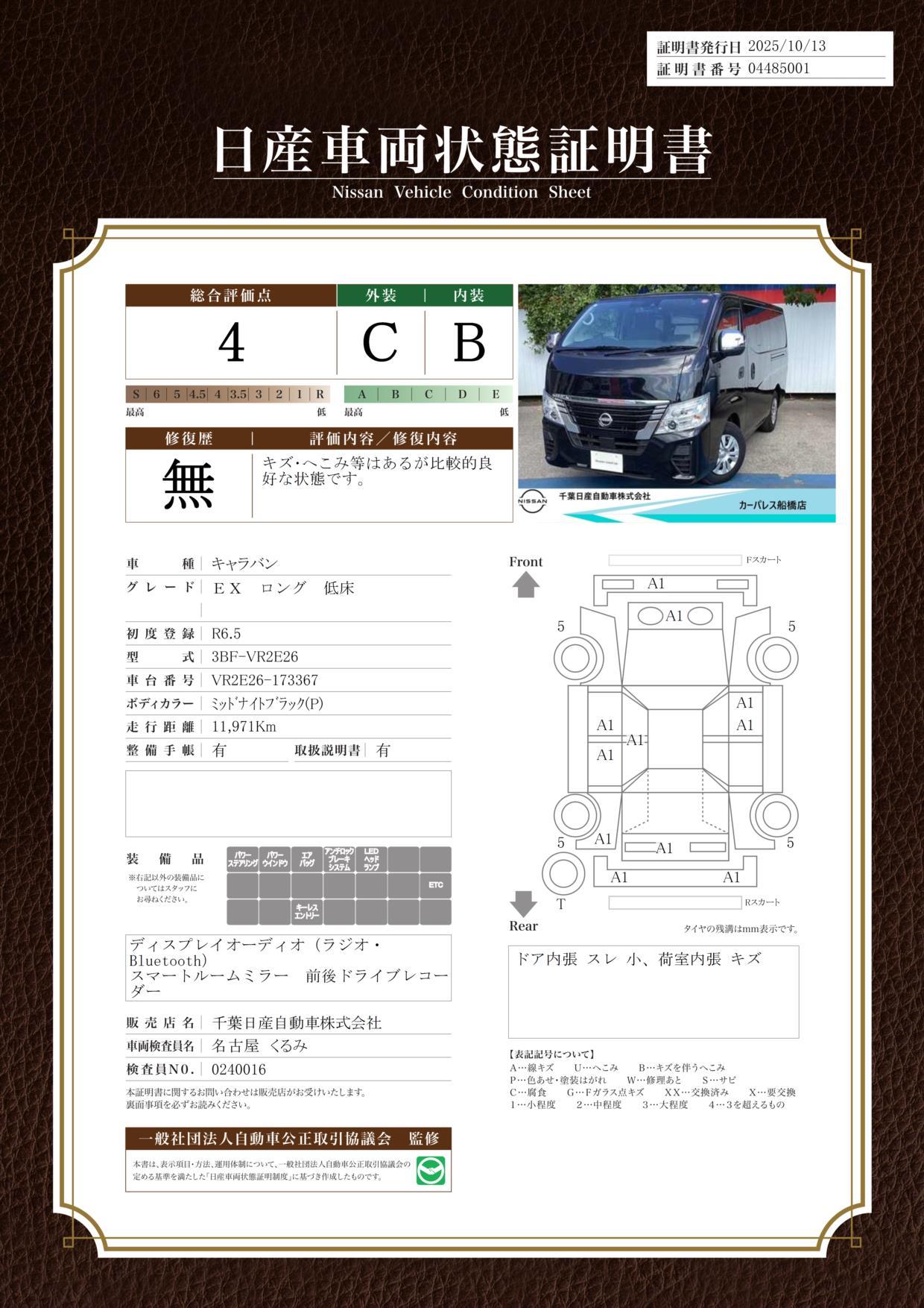 | 車両状態評価書 | ※クリックすると開きます![]() |
