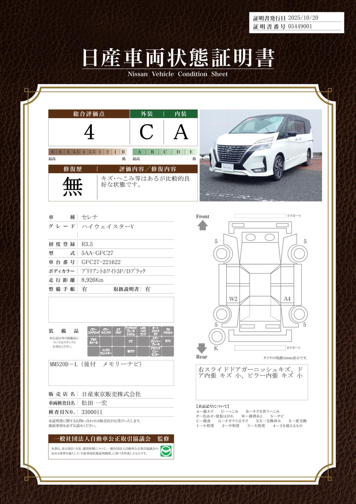 車両保証(セレナ ハイウェイスターV:日産東京販売(株) U-Carひろば三鷹)