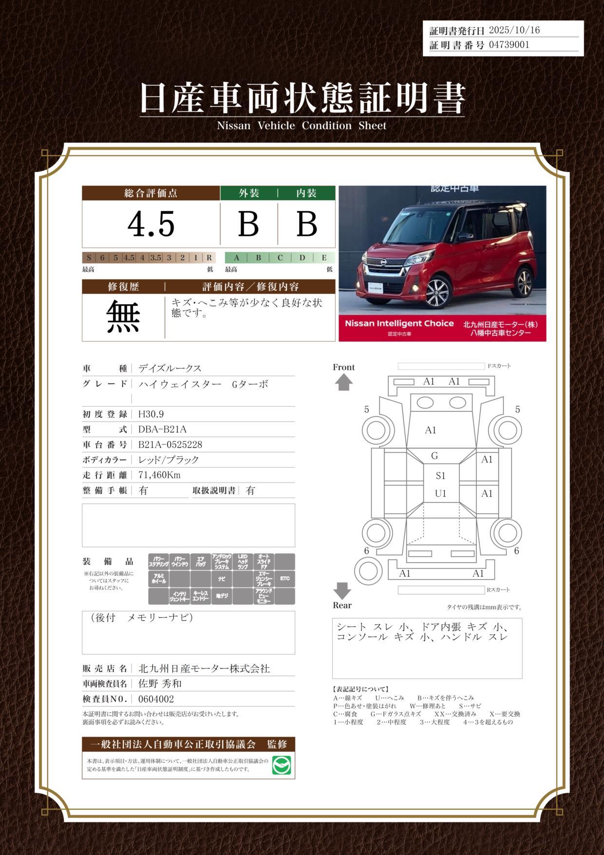 車両保証(デイズルークス ハイウェイスター Gターボ:北九州日産モーター(株) 八幡中古車センター)