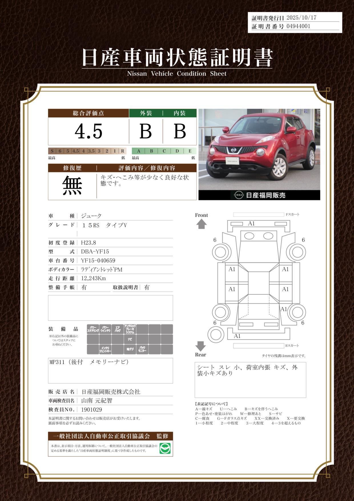 車両保証(ジューク 15RS タイプV:日産福岡販売(株)カーパレス比恵)