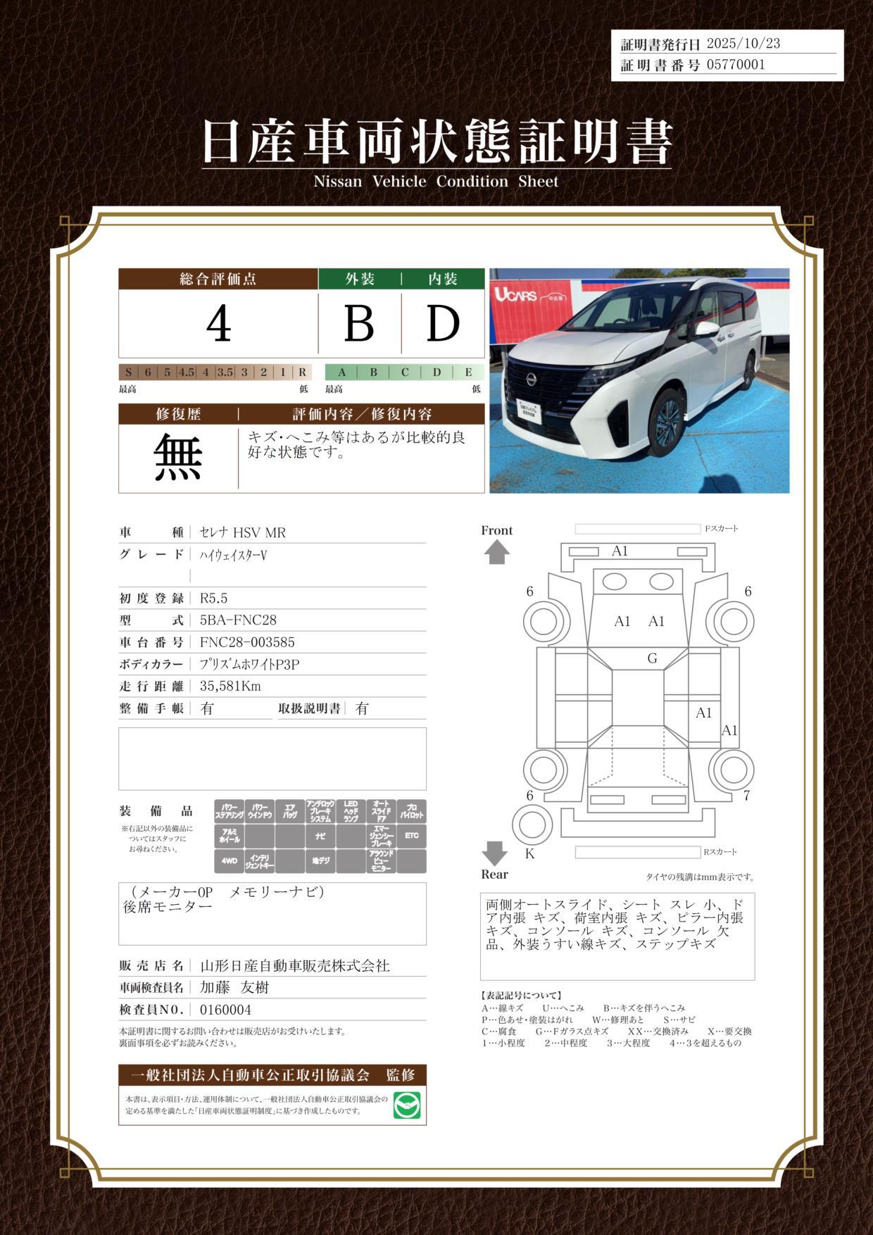 車両保証(セレナ ハイウェイスターV:山形日産自動車販売(株) カーパレス亀ヶ崎)