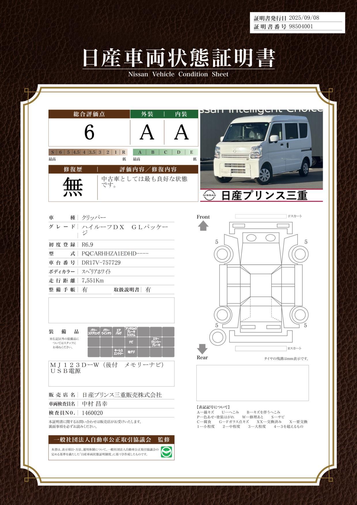 車両保証(クリッパーバン DX GLパッケージ:日産プリンス三重販売(株) U-Car松阪)