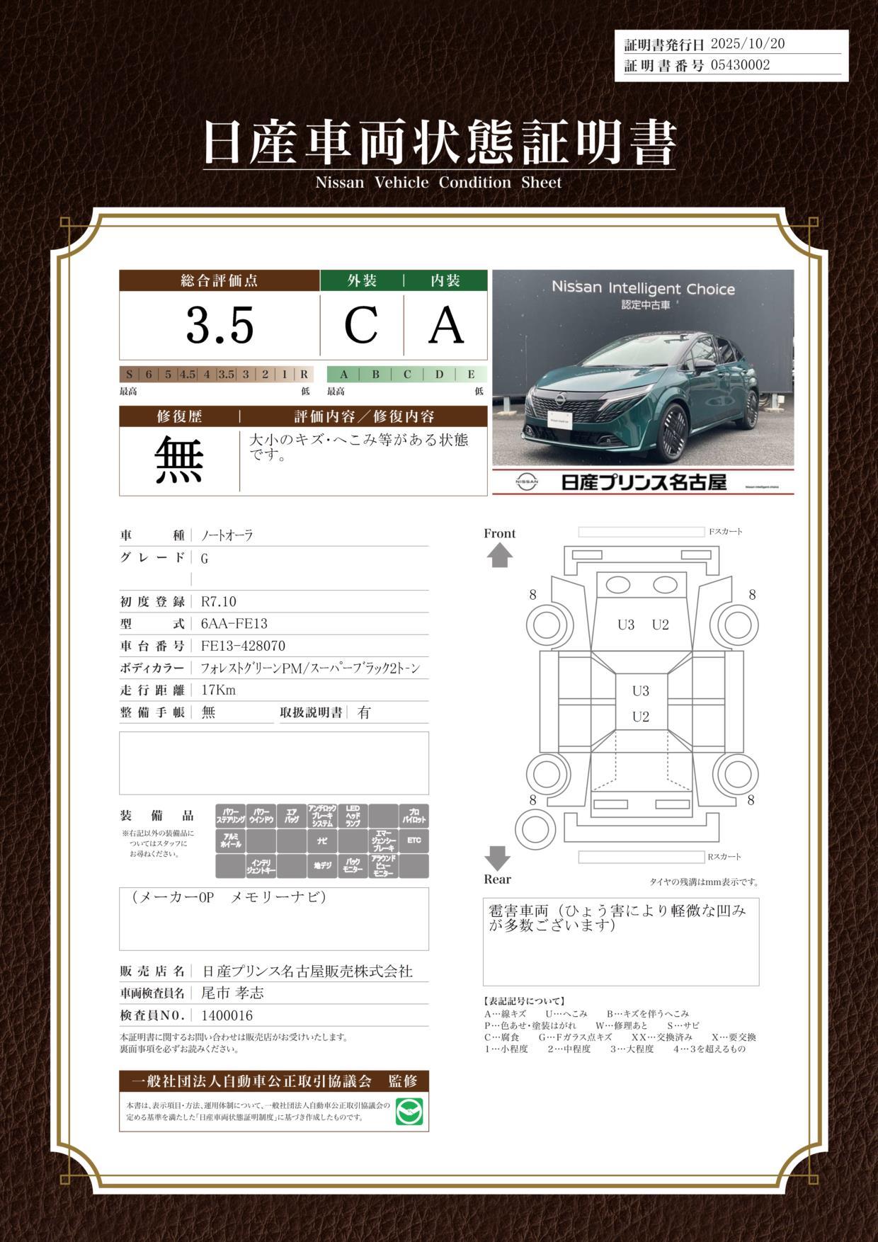 車両保証(オーラ G:日産プリンス名古屋販売(株) カートピア中川)