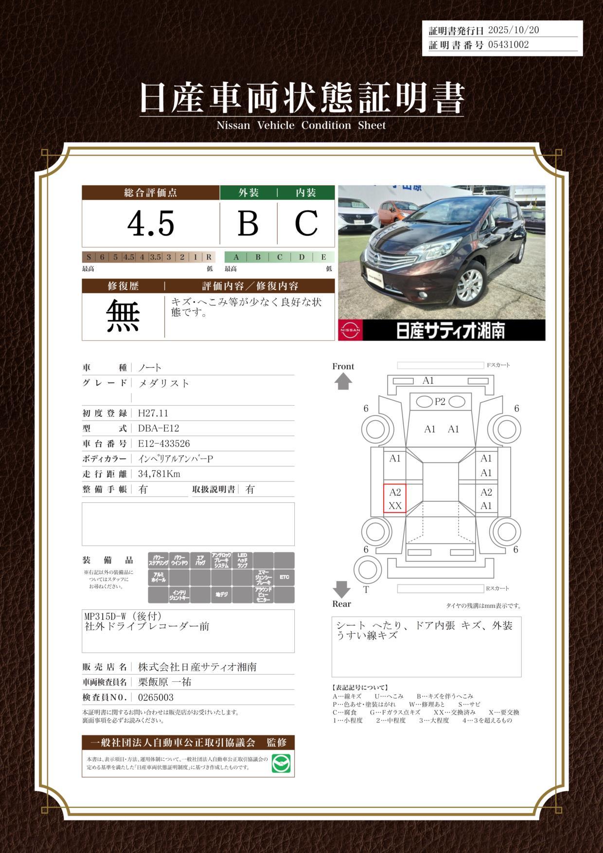 車両保証(ノート メダリスト:(株)日産サティオ湘南 ユーカーマーケット小田原)