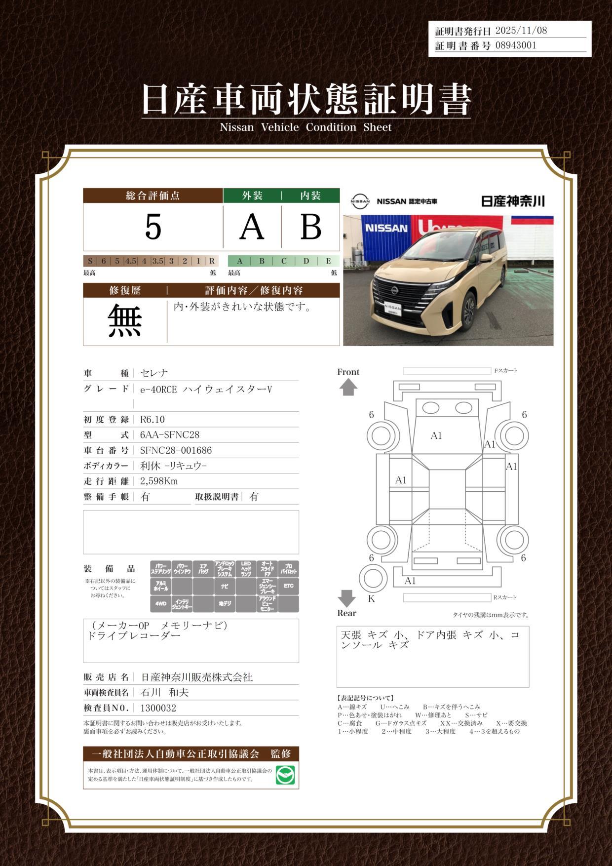 | 整備内容 | 納車前点検整備として、エンジンオイル+オイルエレメント交換&ワイパーリフィル交換等を含む、法定12ヶ月点検整備(車検整備付きは24ヶ月点検整備)相当を、日産プリンス神奈川自社整備工場にて行います。 | ||