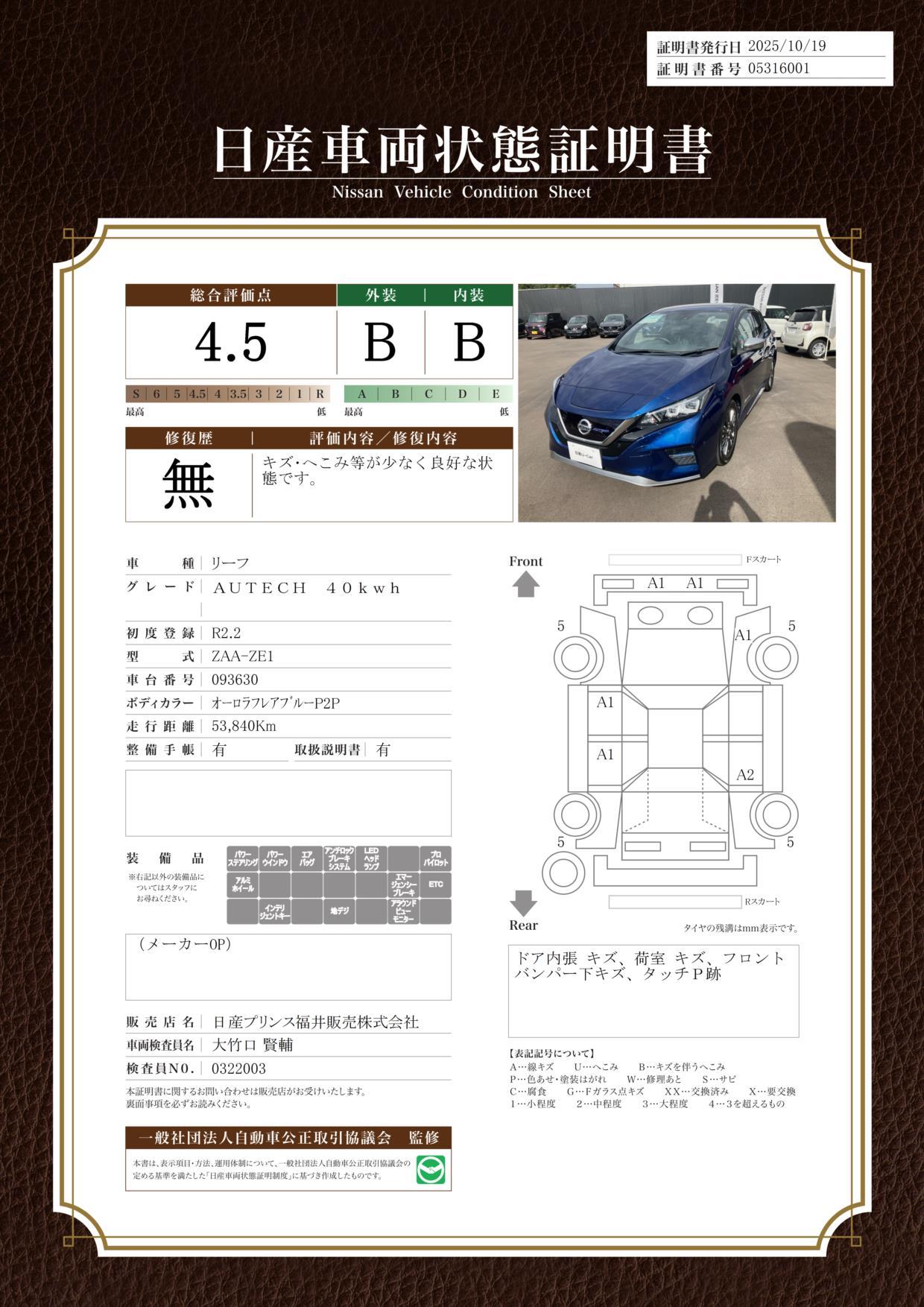 車両保証(リーフ オーテック:日産プリンス福井販売(株)日産カーパレス福井)