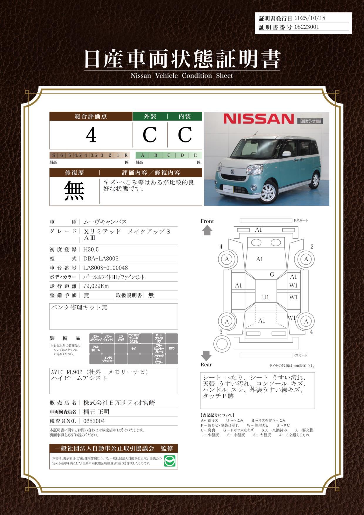 車両保証(ムーヴキャンバス Xリミテッドメイクアップ SAIII:株式会社 日産サティオ宮崎 カーパレス延岡)