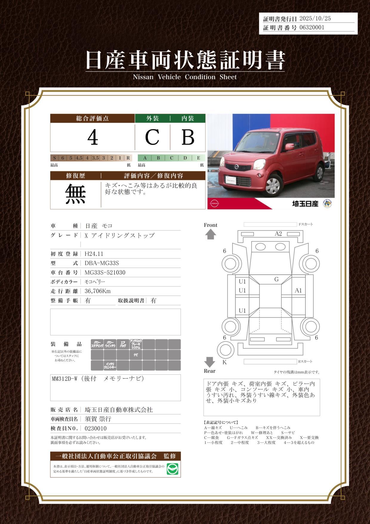 車両保証(モコ Xアイドリングストップ:埼玉日産自動車(株) U-cars川口)