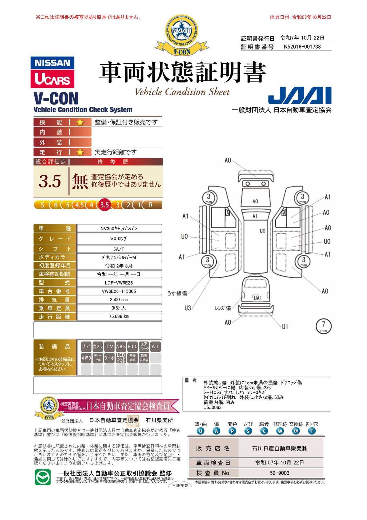 車両保証(NV350キャラバンバン ロングVXターボ:石川日産自動車販売(株) UCARS金沢)