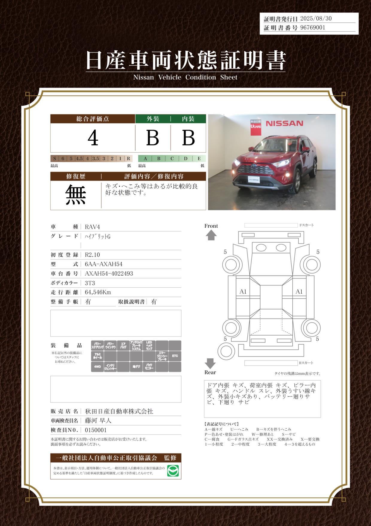 | 車両状態評価書 | ※クリックすると開きます![]() |
