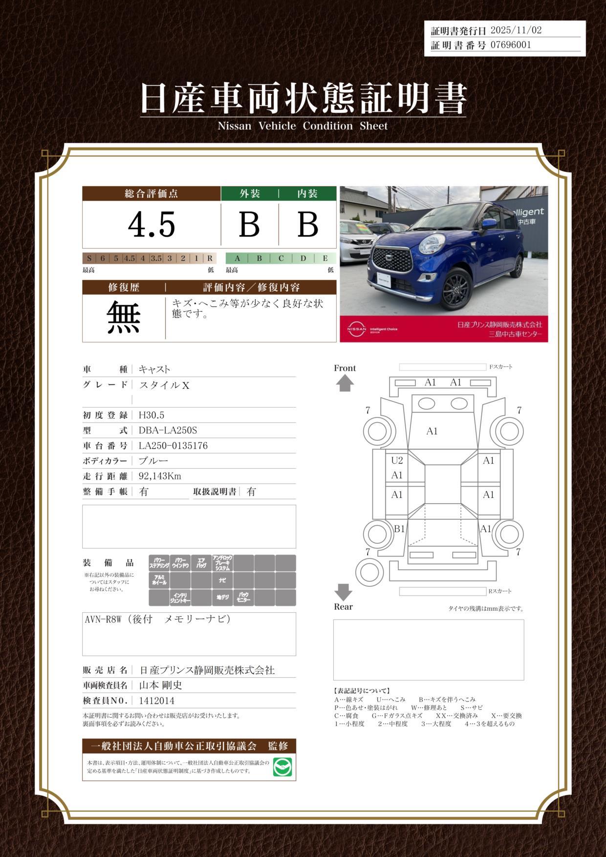 車両保証(キャスト スタイルX:日産プリンス静岡販売 三島中古車センター)