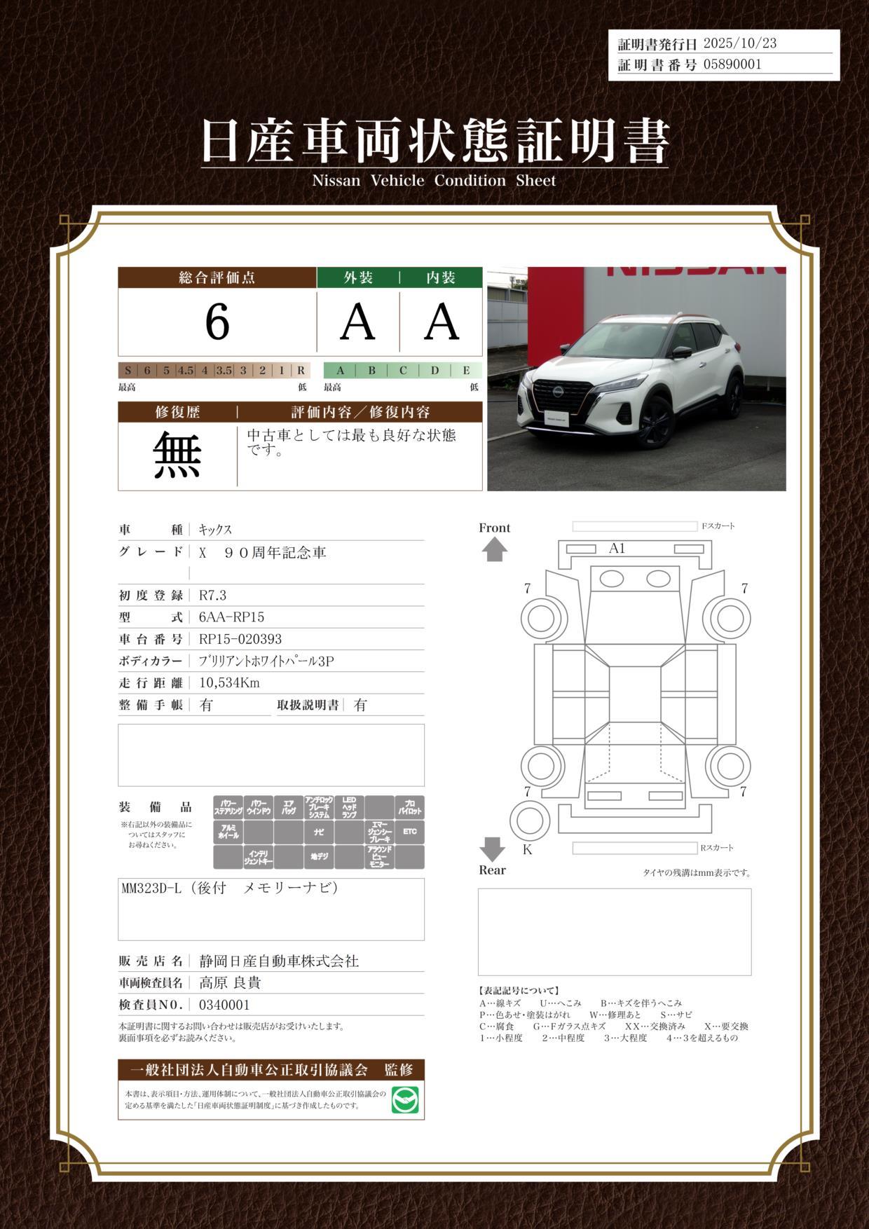 車両保証(キックス X 90周年記念車:静岡日産自動車 鷹岡カープラザ)