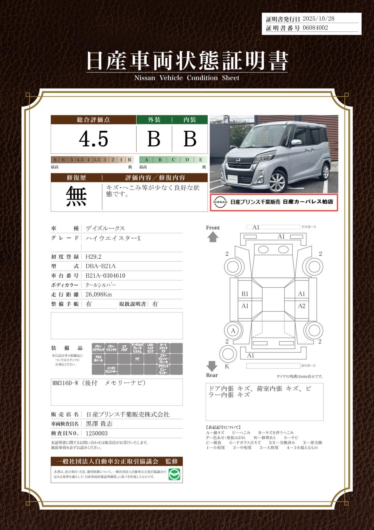 車両保証(デイズルークス ハイウェイスター X:日産プリンス千葉販売株式会社 日産カーパレス柏店)