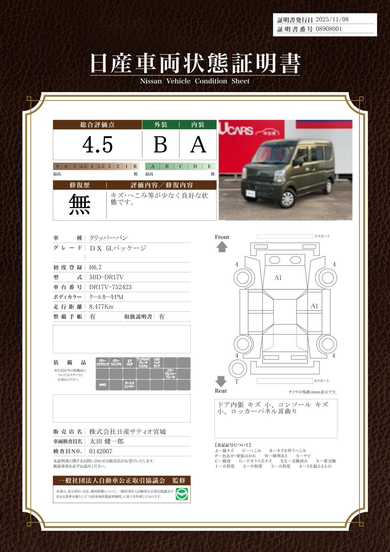 | 車両状態評価書 | ※クリックすると開きます![]() |