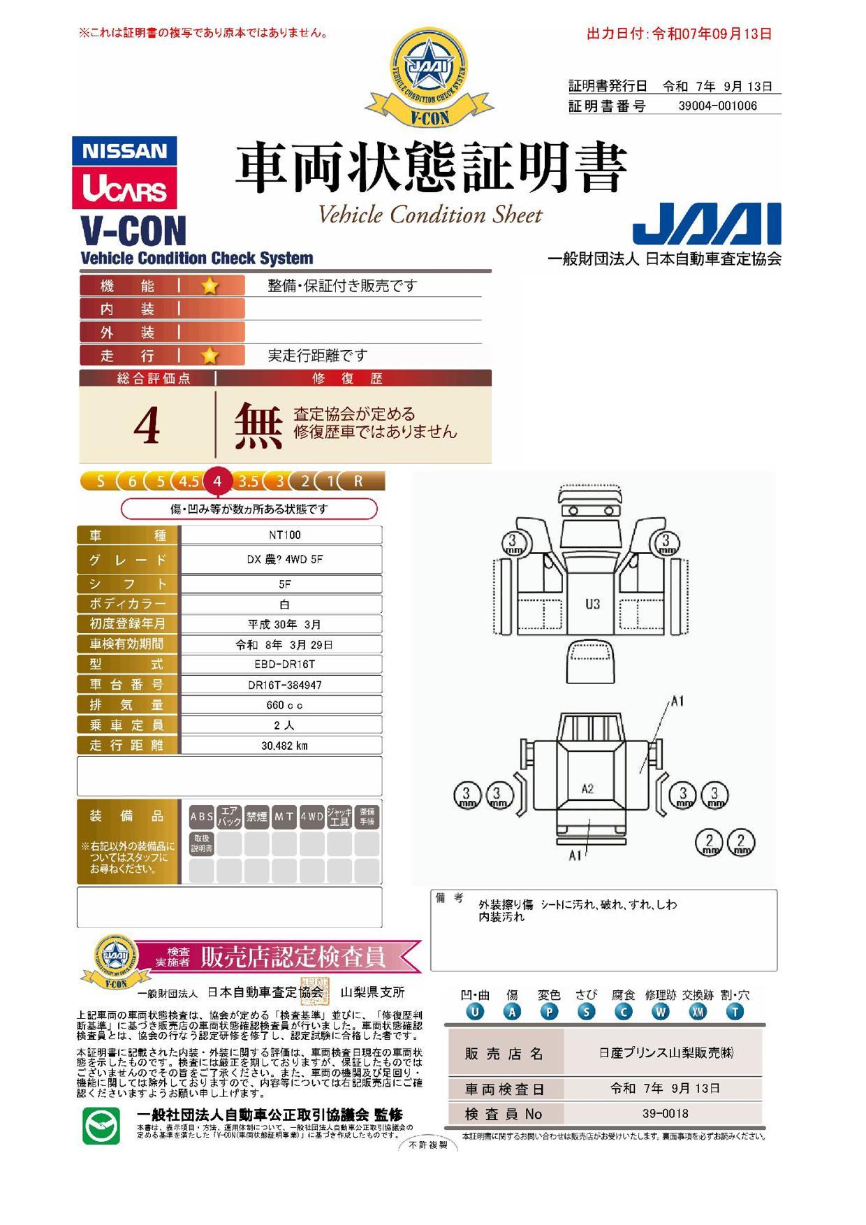 車両保証(NT100クリッパートラック DX農繁仕様:日産プリンス山梨販売(株)Uカー美術館通り貢川店)