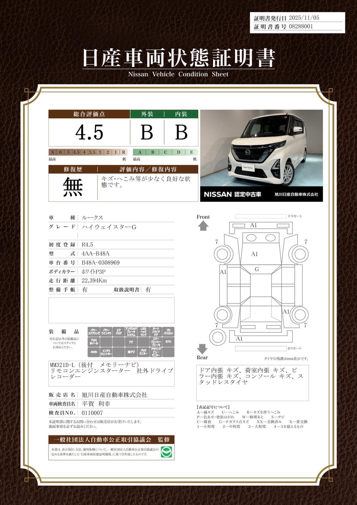 車両保証(ルークス ハイウェイスター Gターボプロパイロットエディション:旭川日産自動車(株)カーパーク神居)